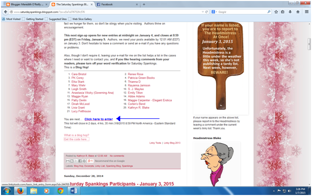 Authors, we also have a Pinterest Page that I try to keep updated with the books being excerpted on Saturday Spankings. Check the sidebar for details, and feel free to link to it if you want. Your cover will point back to your post for that week.